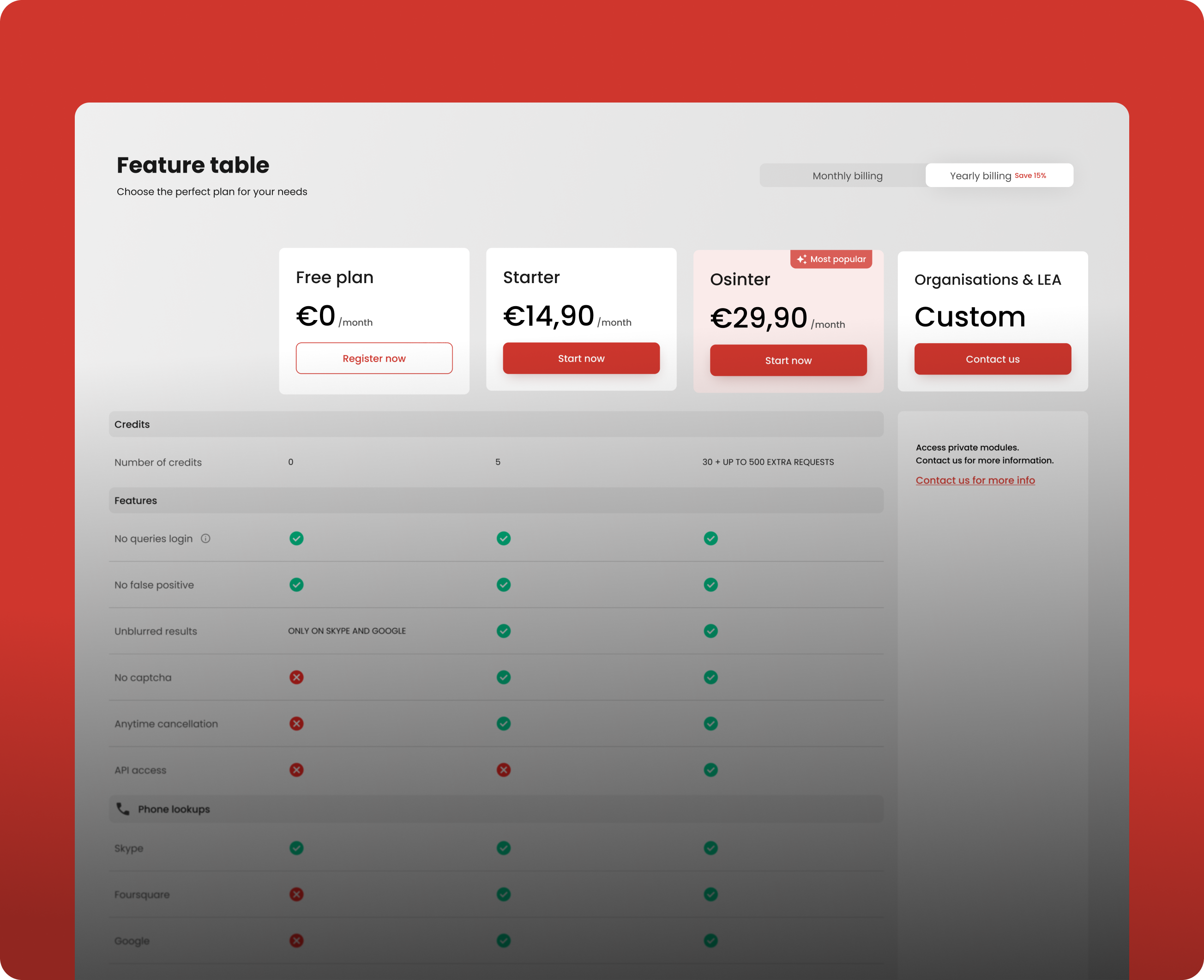 To create a smoother upgrade path and therefore increasing the conversion opportunities, we added a new Starter plan positioned between the Free and Osinter plans.