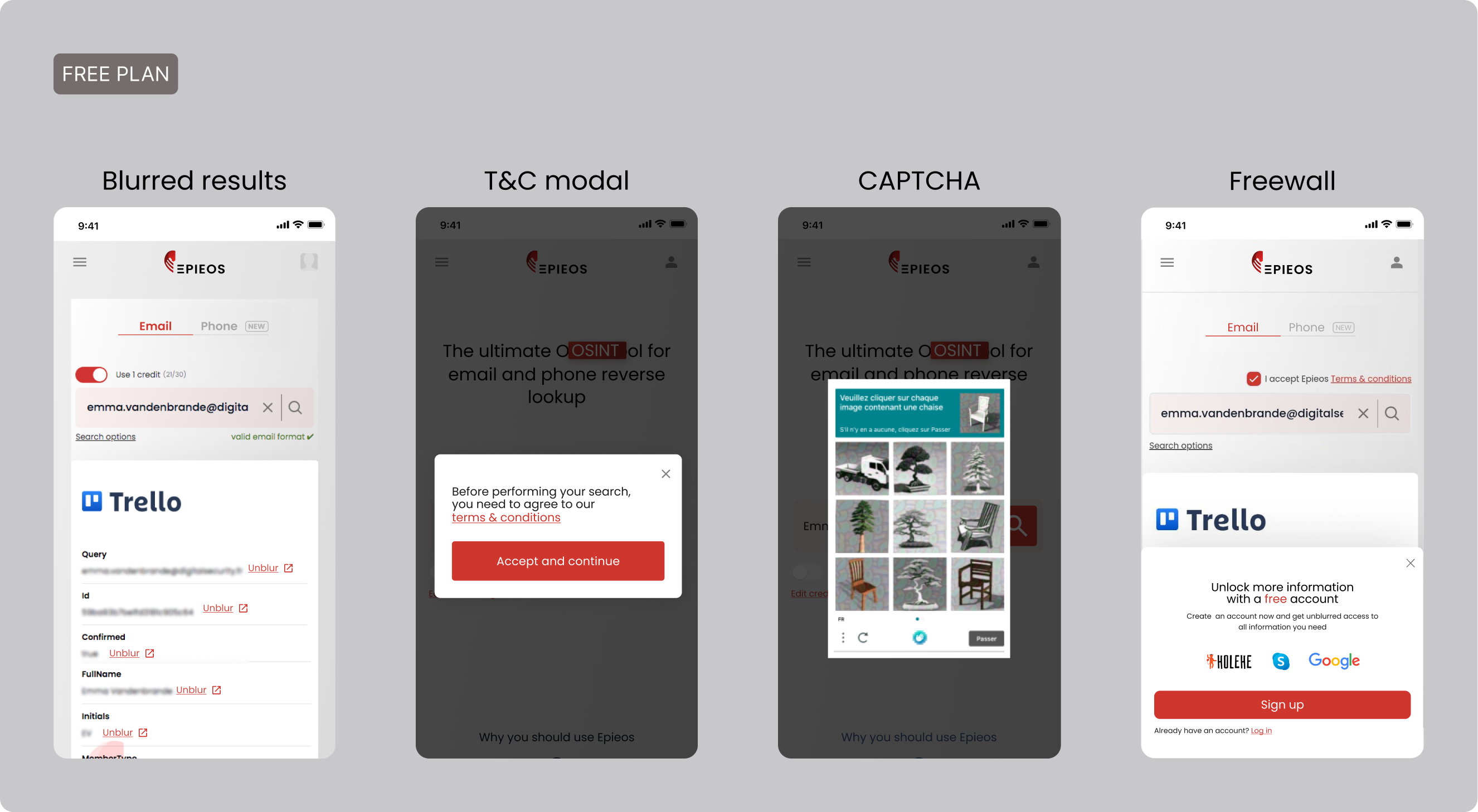 - The Freewall offered limited access to core functionality allowing users without an account to explore Epieos without commitment.