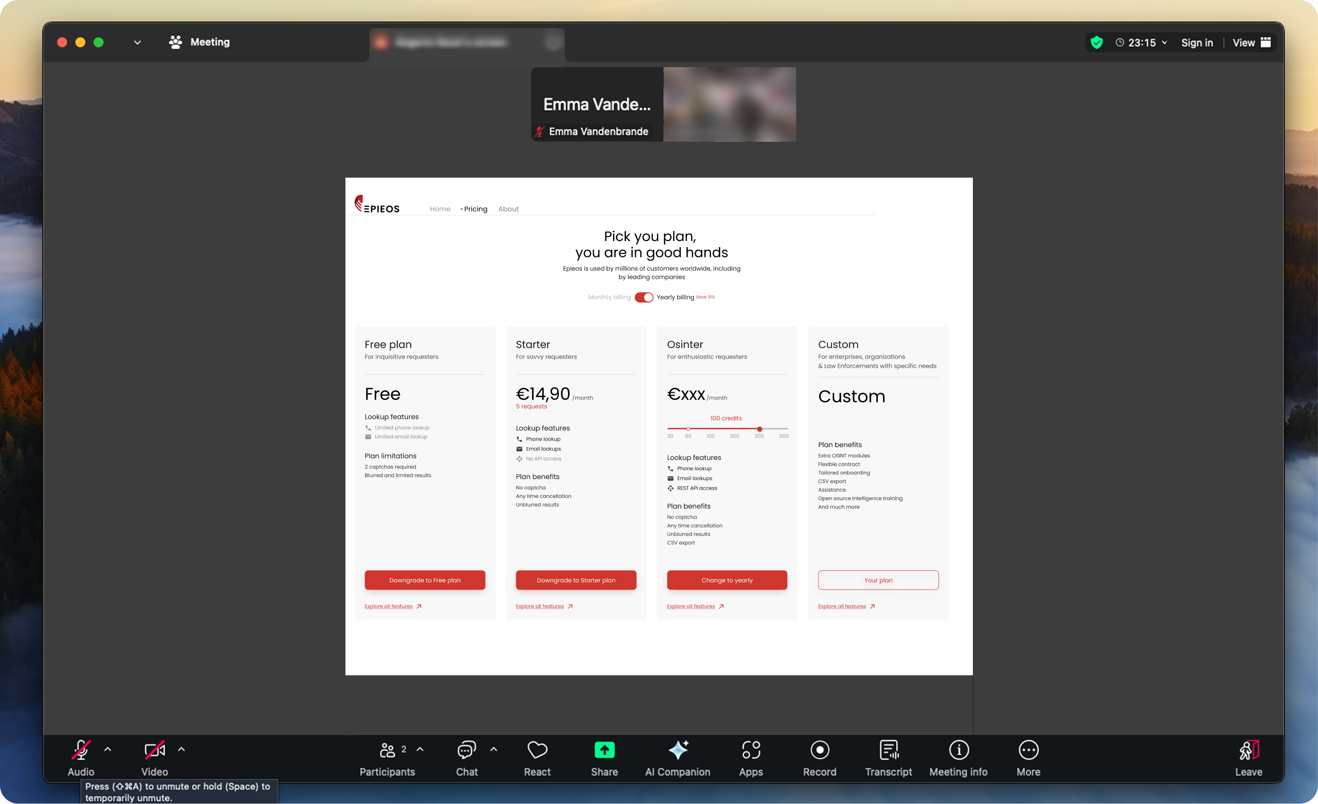 To ensure that our proposed pricing experience redesign met real user needs, we conducted a series of moderated user tests via Zoom. These sessions allowed us to validate our ideas, uncover usability issues, and gather qualitative feedback from a diverse group of existing Epieos users.
